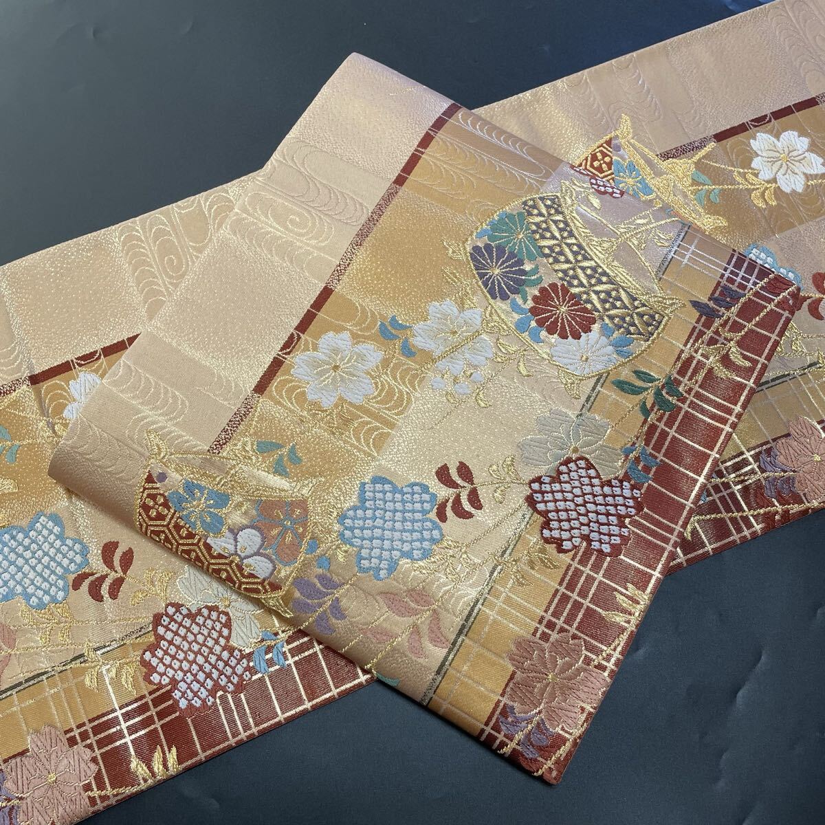 - #G185 美品 袋帯 六通 西陣織 綴織 金糸 糸巻 桜 正絹 和装 和服 フォーマル帯【wellriver】