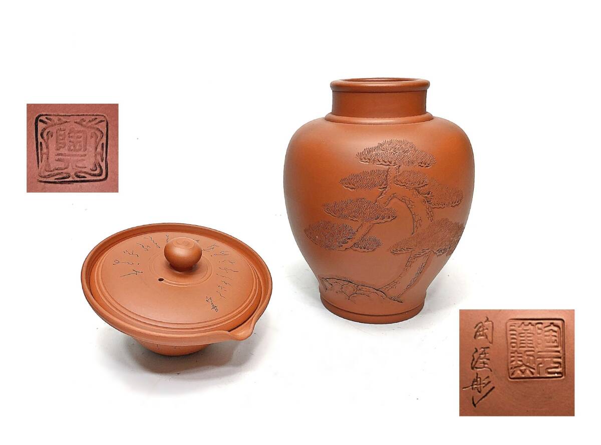 - 常滑朱泥 陶元在銘 彫 花瓶 宝瓶 二品