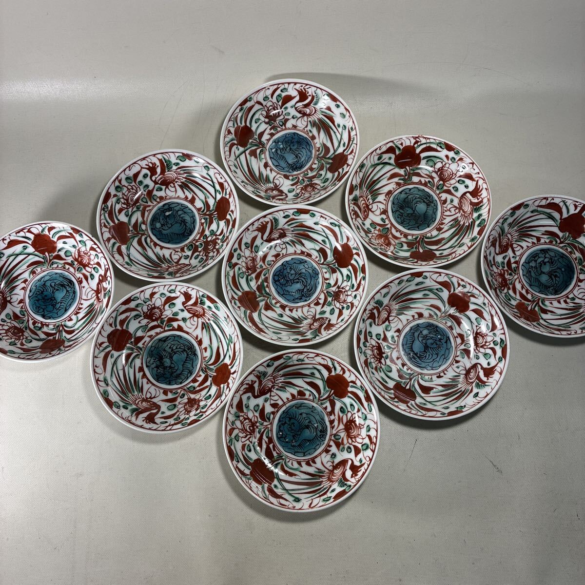 - 永楽善五郎造 呉須赤写 鳳凰唐獅子呉須赤絵なます皿 9客