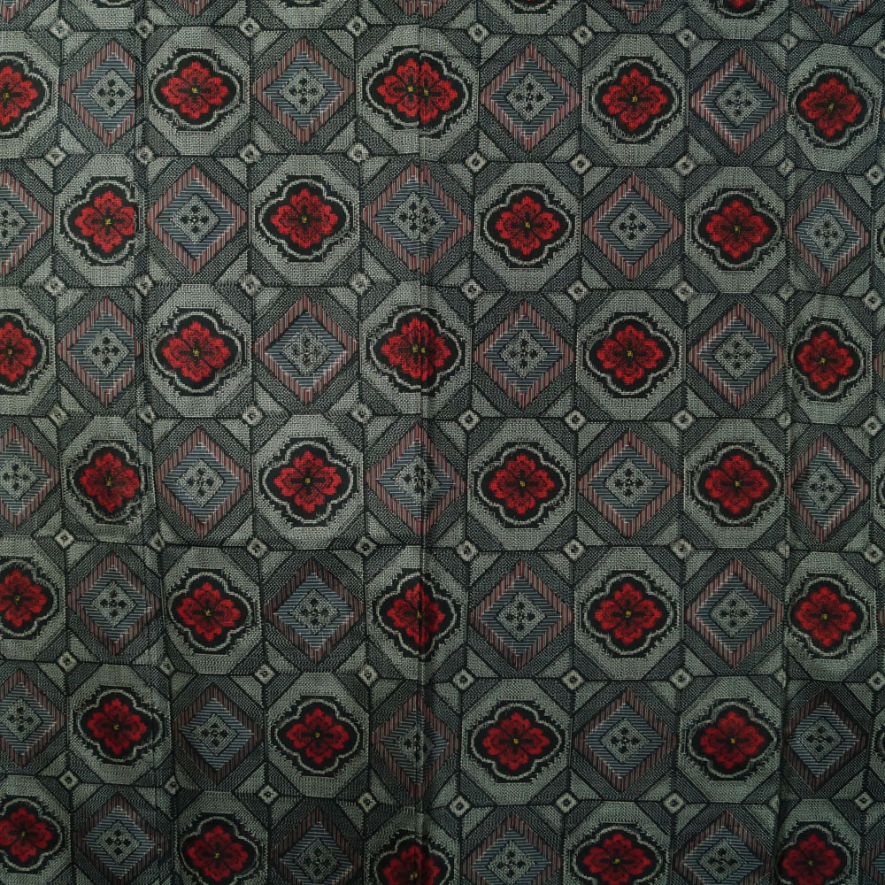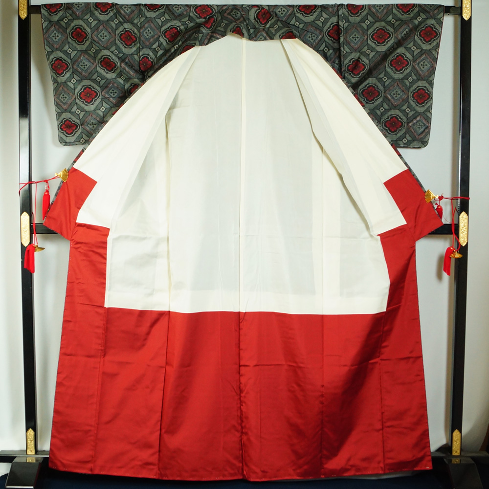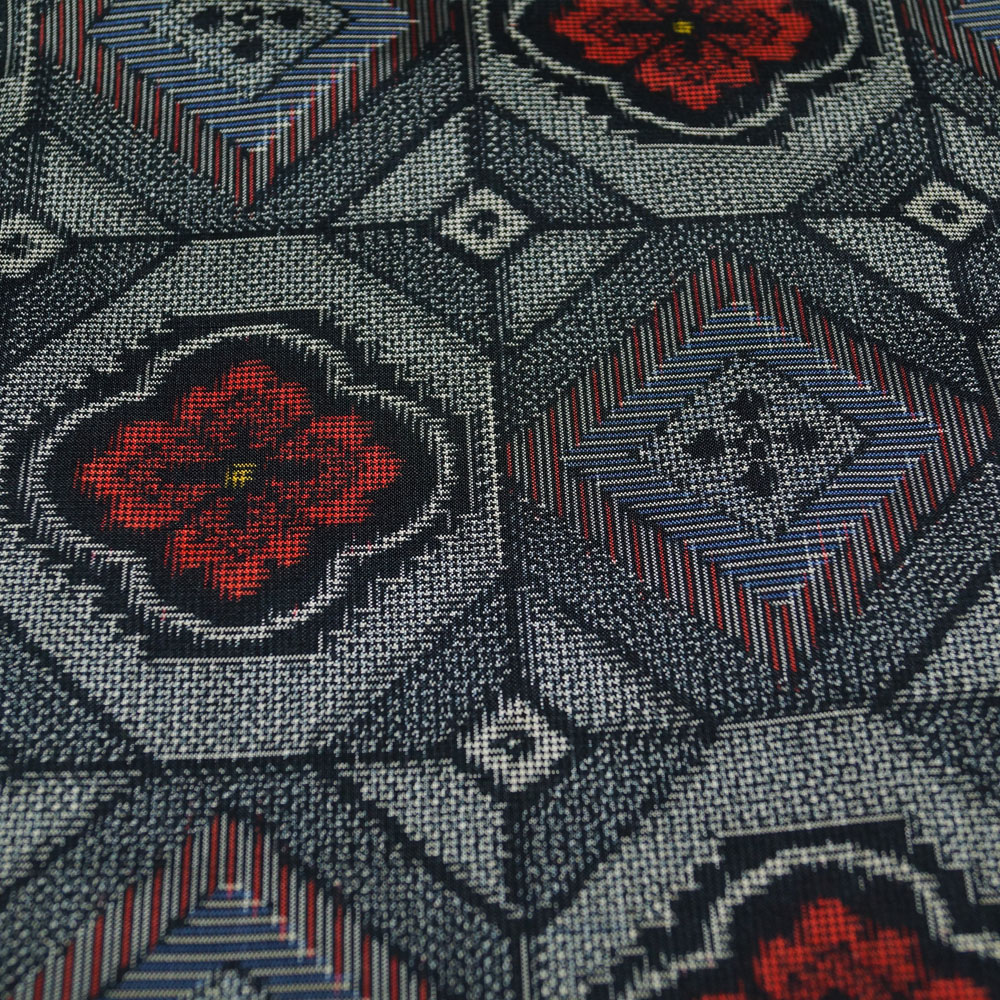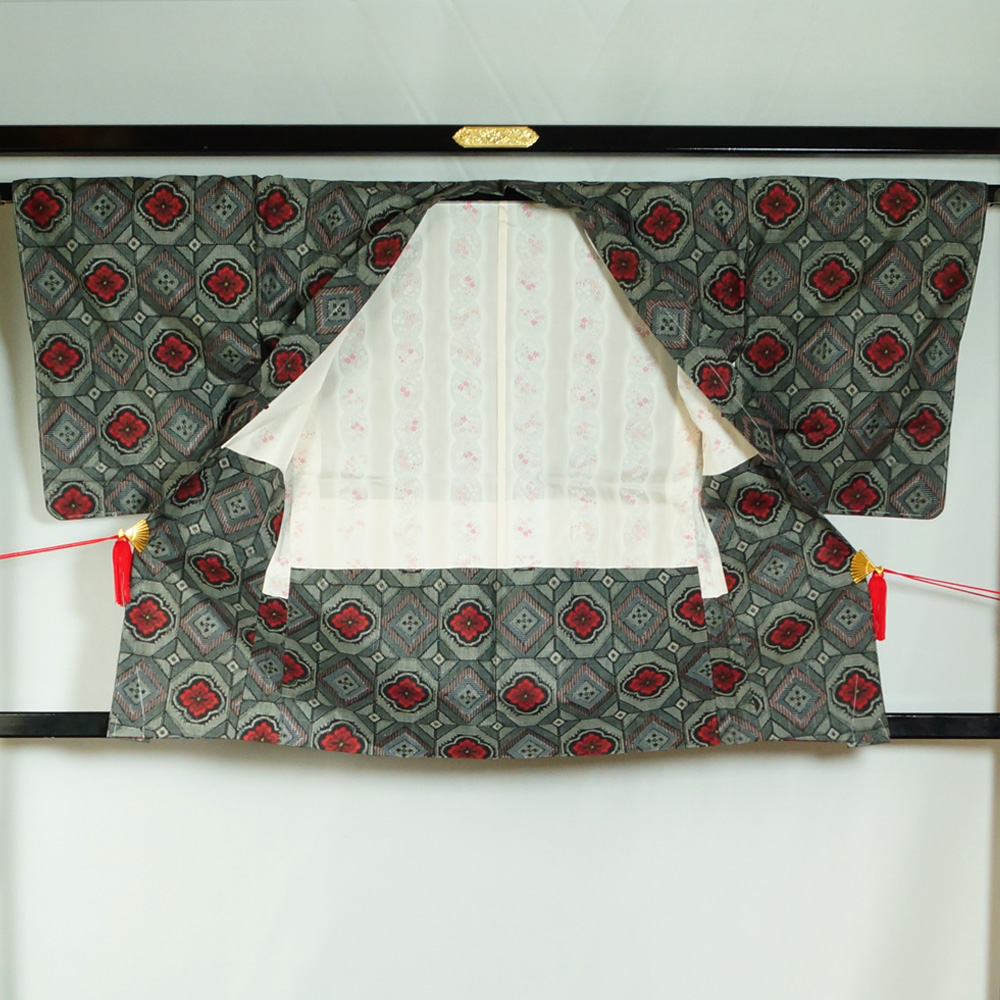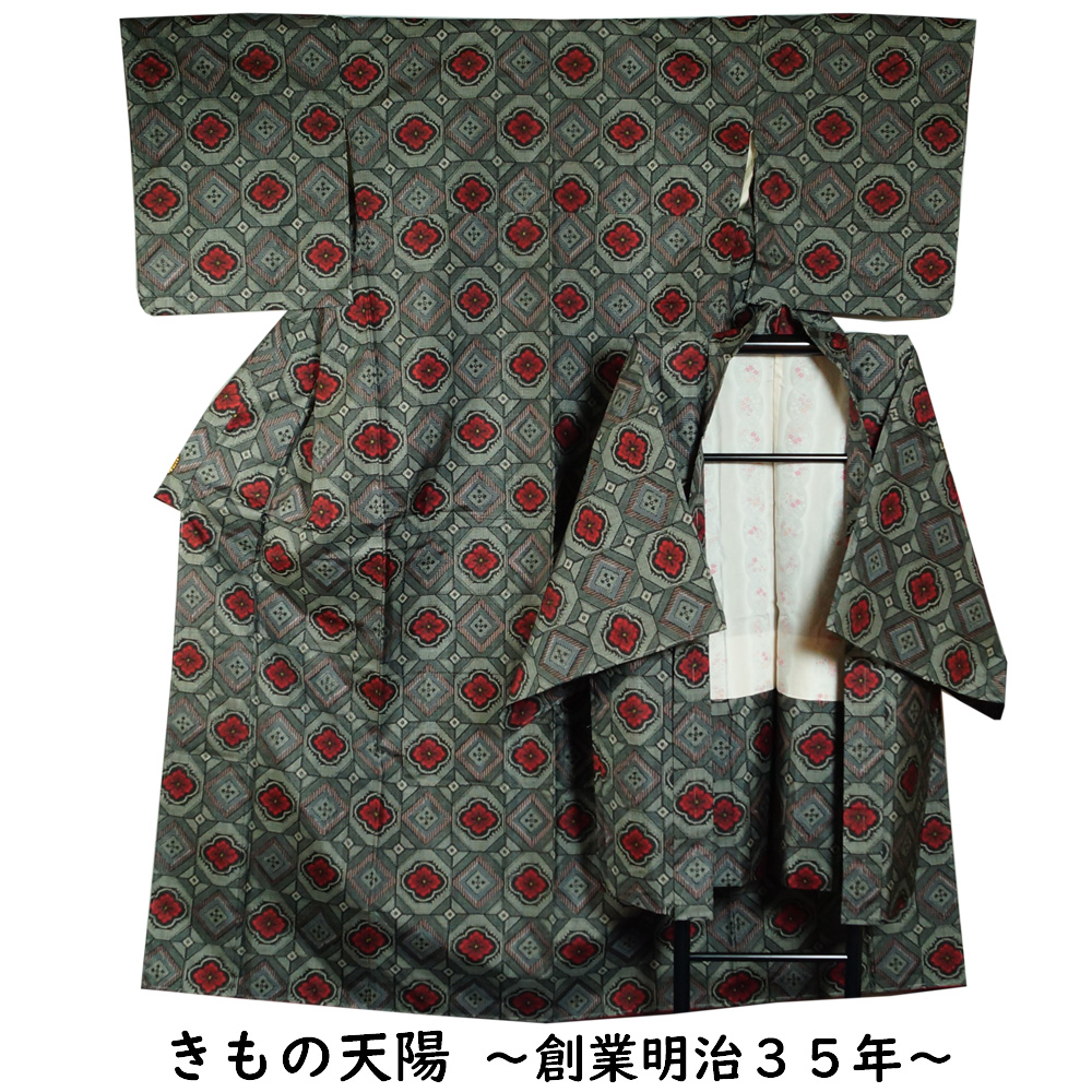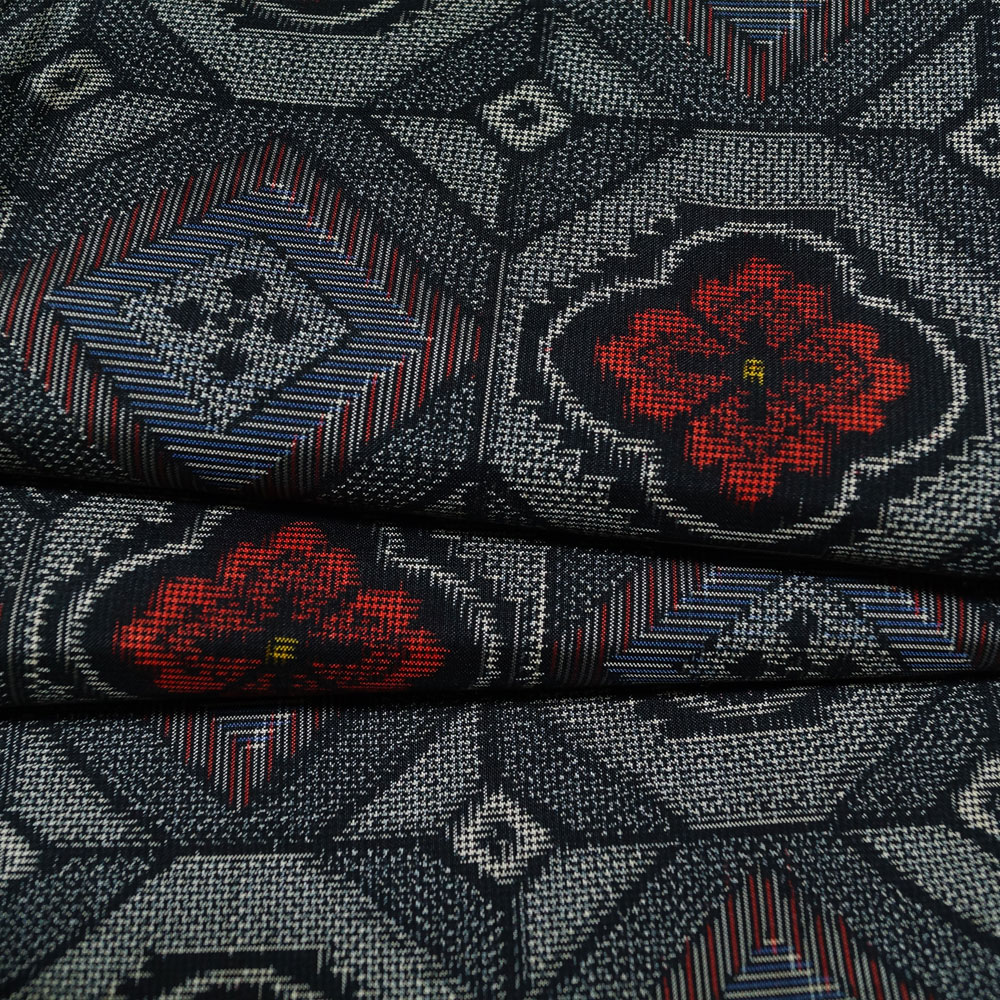 - 村山大島紬 アンサンブル 未使用品 着物・羽織 格子に花菱模様 Lサイズ 黒色系 村山 大島 紬 中古 リサイクル着物 正絹 京都きもの天陽