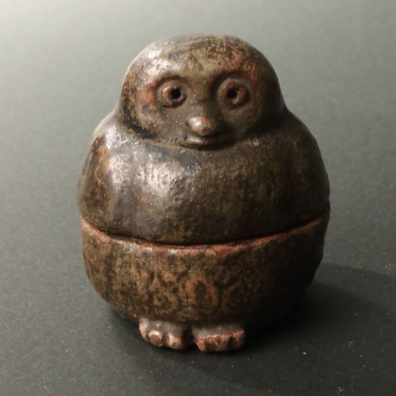 - 委託HK◇伝本阿弥光悦 赤楽梟香合(茶道具 陶磁器 陶芸 京焼 楽焼 みみずく 木菟 夜咄 茶事 炉 秋 冬 炭点前 不苦労 福来郎 縁起物 飾り)