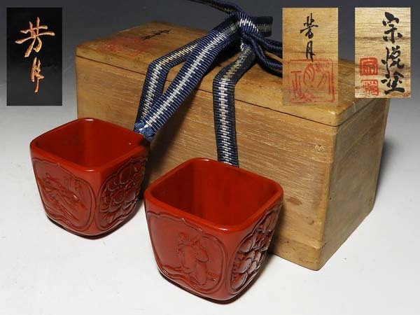 - 【桃】酒器ぐい呑み:赤漆四方盃一対 宗悦塗 芳月作