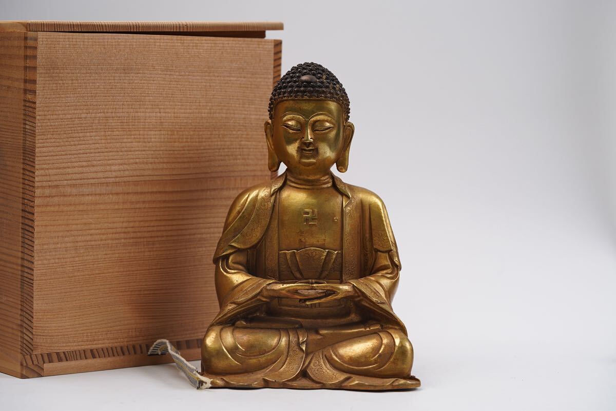 - 【竹華】中国古美術 古銅製 銅金 鍍金仏 仏像 中国古玩 古玩 骨董 時代物 当時物 唐物 古銅 青銅器 骨董品 仏教美術 箱付