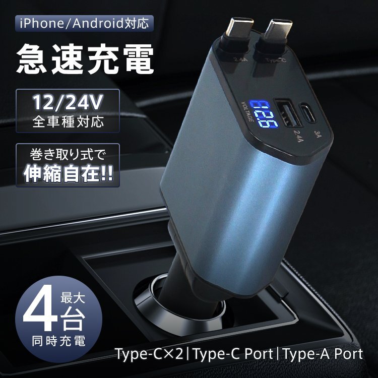 - 送料無料 カーチャージャー USB シガーソケット Type-C タイプC 充電器 車 車載充電器 巻き取り 4in1 急速充電 Type-A タイプA 12V tkee013