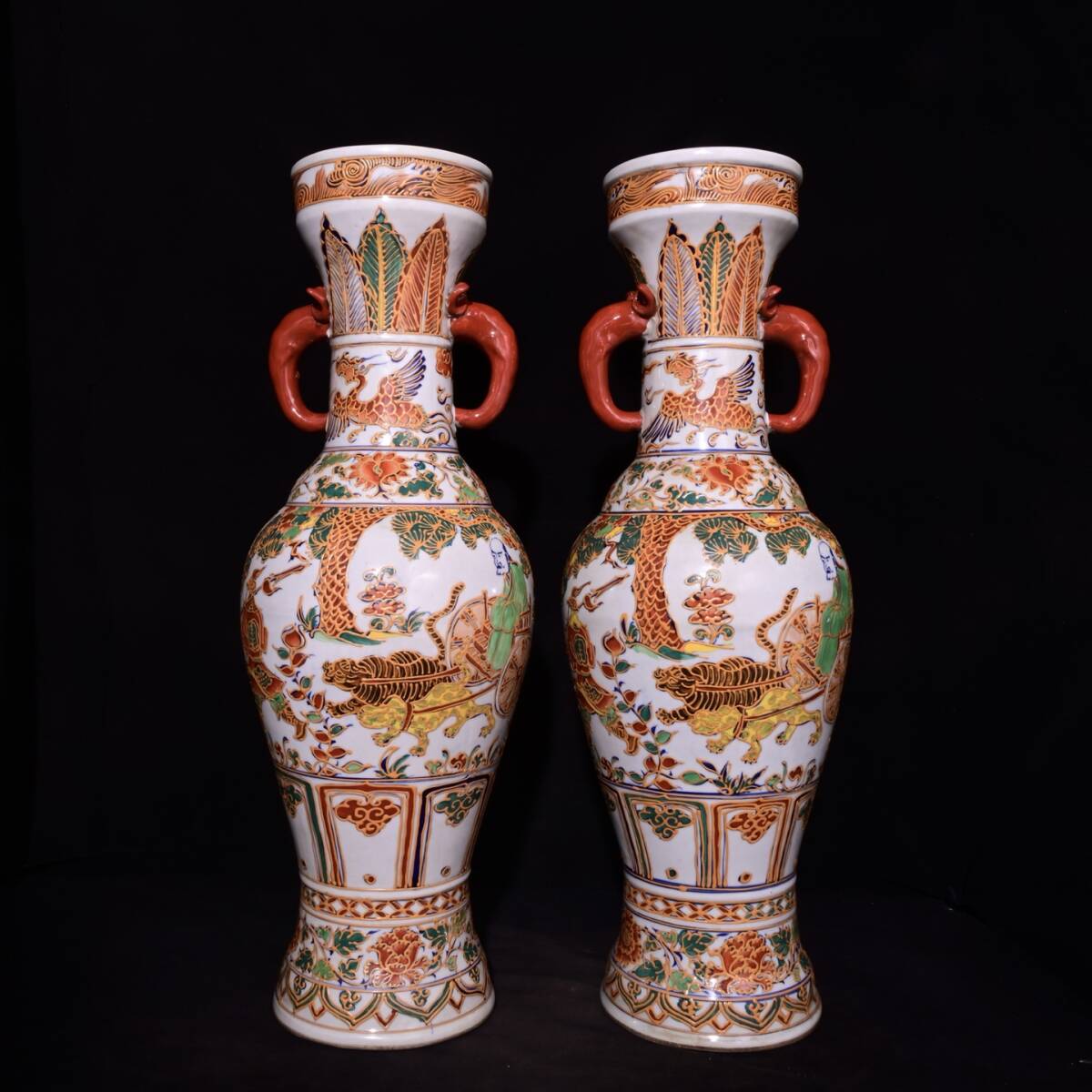 - AUL0563 人間国宝 古磁器 白磁【元博陵第張文進款五彩瀝粉鬼谷子下山人物故事紋象耳瓶】 工芸品 陶芸 磁器 置物 收藏品 時代物 中国美術