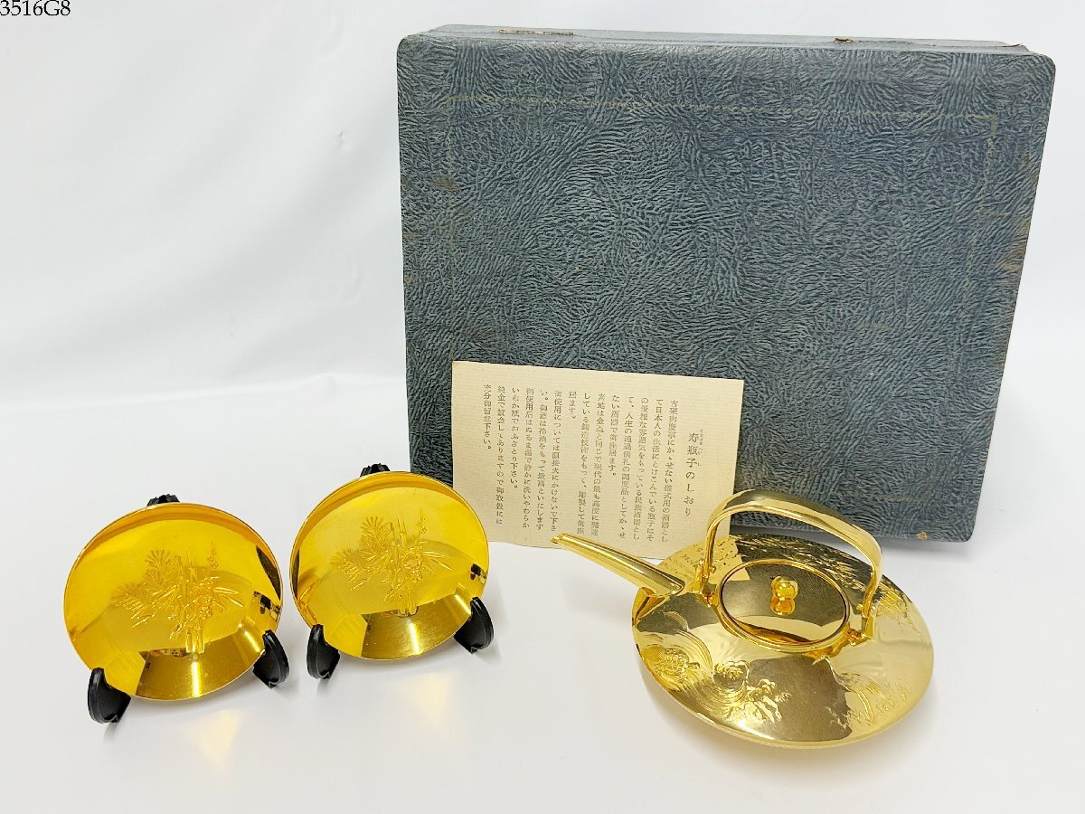 > 金急須 金杯 鶴亀 松竹梅 24K GP 刻印 酒器 縁起物 お祝い 金メッキ アンティーク 箱付き 3516G8-2