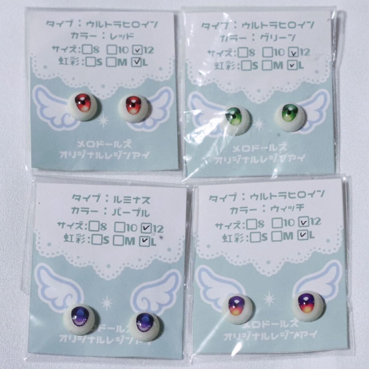 > ディーラー様製 レジンアイ 12mm 4個セット 赤 緑 紫 //ドールアイ オビツ OB parabox ヒカリヘッドetc. レッド グリーン パープル
