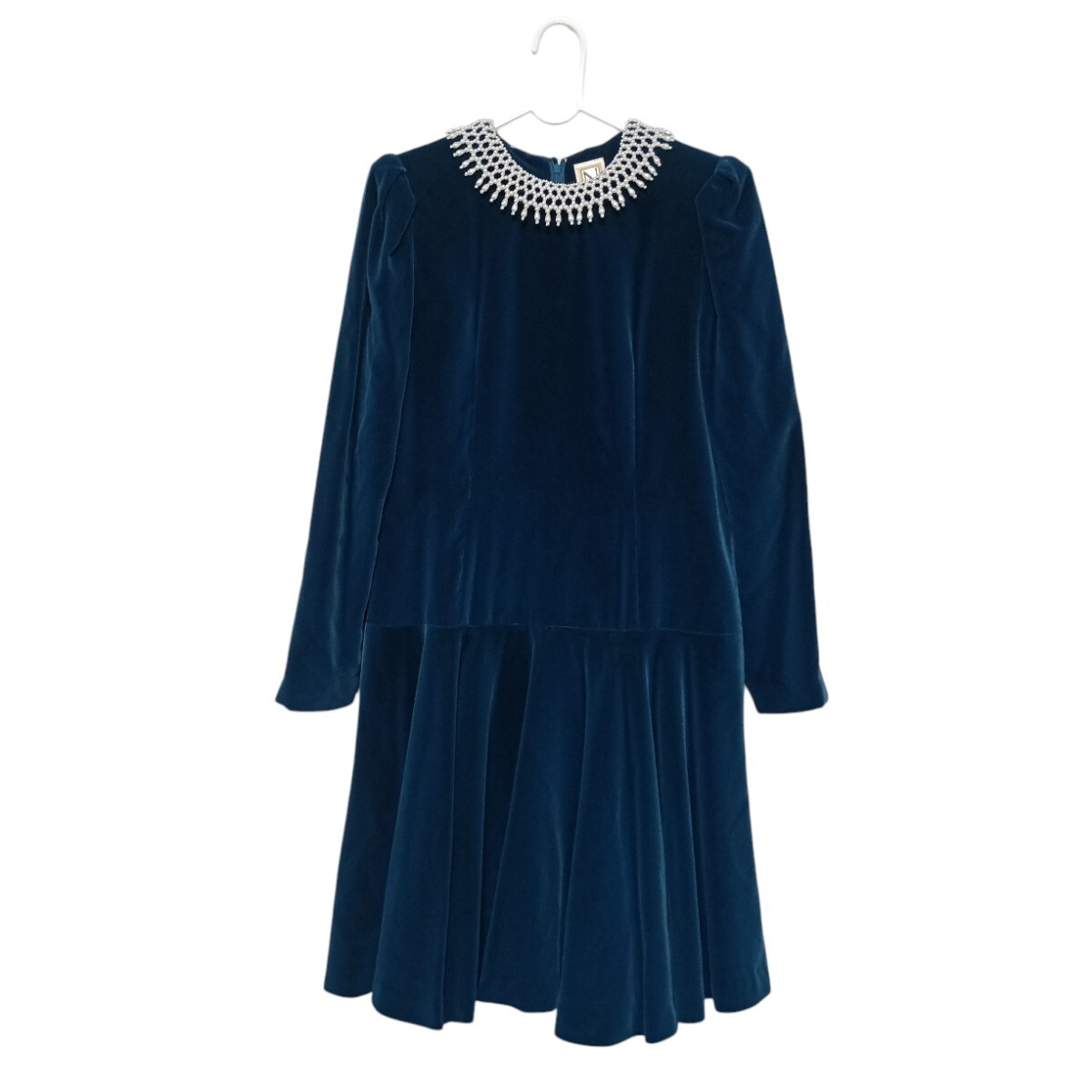 - saekiyukimoriダークティールベルベット パールネックラインワンピース ベロア 長袖 ロング フォーマル