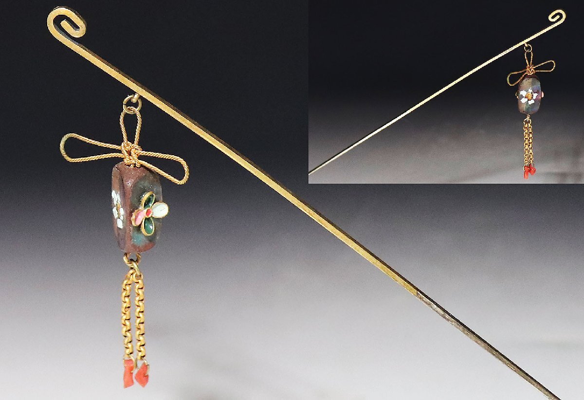- 【桃】アンティーク髪飾り:金工銀地鍍金貝七宝ビラ簪
