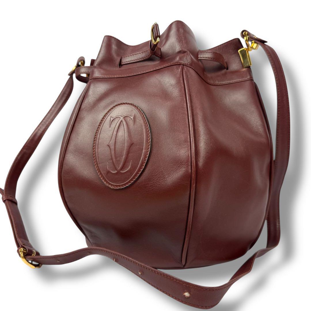 - 【良品】Cartier カルティエ マストライン センターロゴ 巾着 ショルダー バッグ バック 斜めがけ カバン レザー 本革 ボルドー レッド 赤
