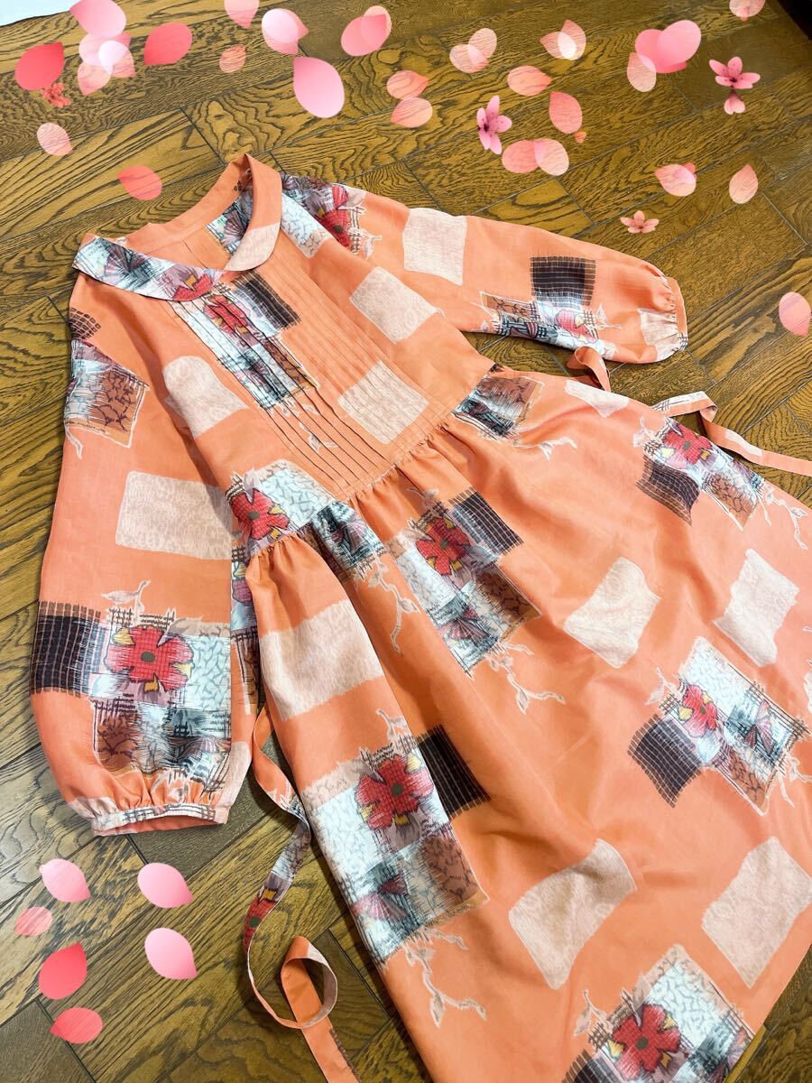 - 銘仙/手織絣/未使用反物/水通し済み/丸襟/ピンタックワンピース/ウエストリボン/パフスリーブ/着物リメイク/花/サーモンピンク/