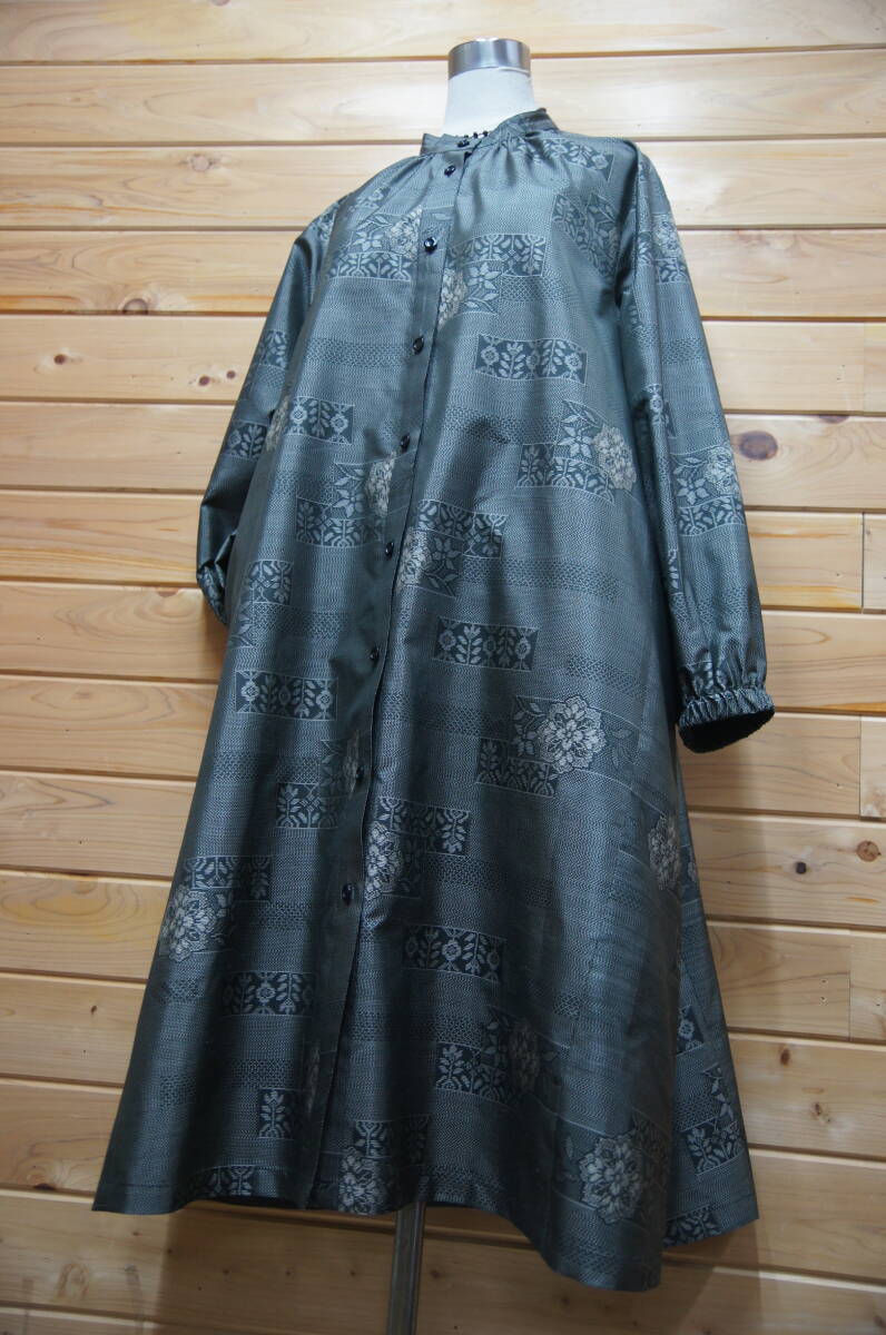 - 松鶴 着物 リメイク 和柄 ハンドメイド 村山大島紬~衿元ギャザー 前開きAラインワンピース