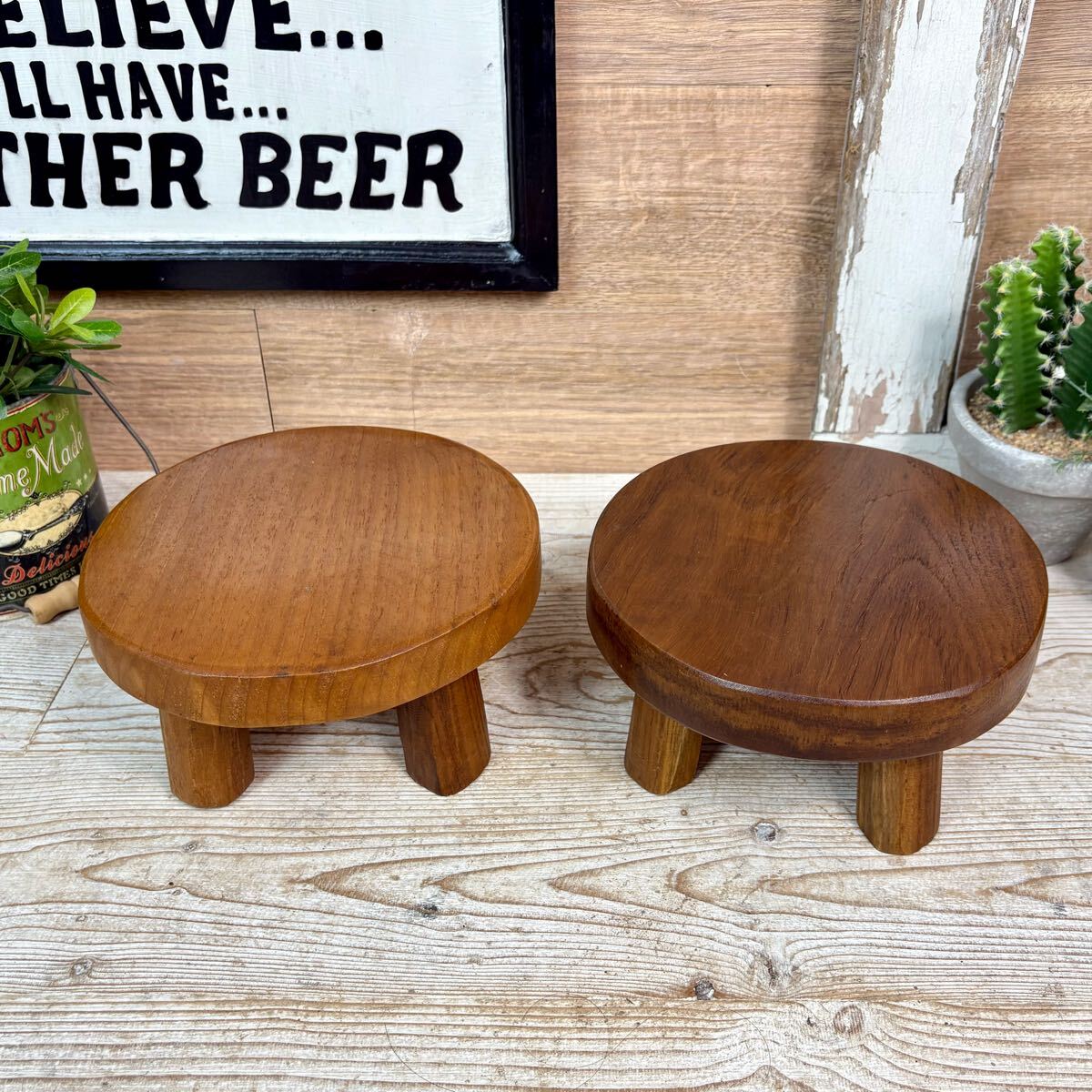 - 送料無料、オールドチーク天然無垢材、脚付ミニ花台(直径20㎝)2点セット、飾り台、フラワースタンド、ミニテーブルディスプレイ台