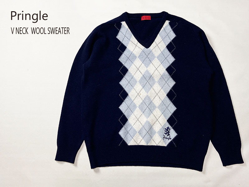 > 【スコットランド製】毛100% Pringle プリングル Vネック ウール セーター メンズ XL アーガイル柄 ロゴ刺繍