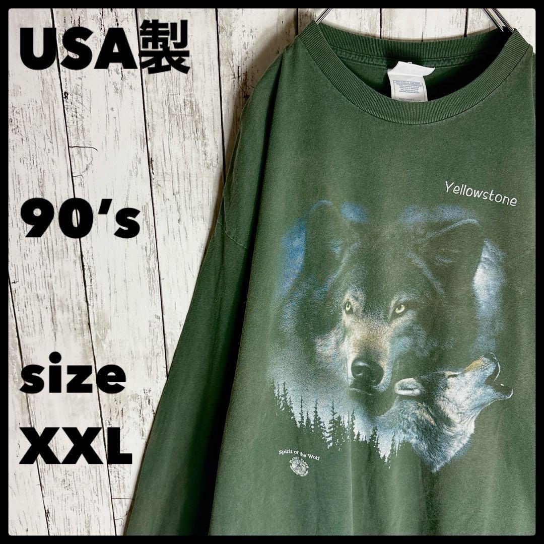 - オオカミ USA製 アニマルプリント XXL ロンT 狼 90s グリーン tシャツ 90s