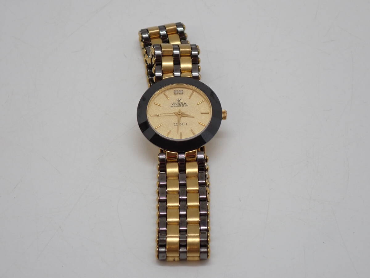 > 52718 ★ ゼブラ ZEBRA ZIRCONIUM BEZEL MIND 18K GOLD CROWN 刻印 0094 J007 腕時計 クォーツ 不動 ジャンク ★ 中古品 経年保管品