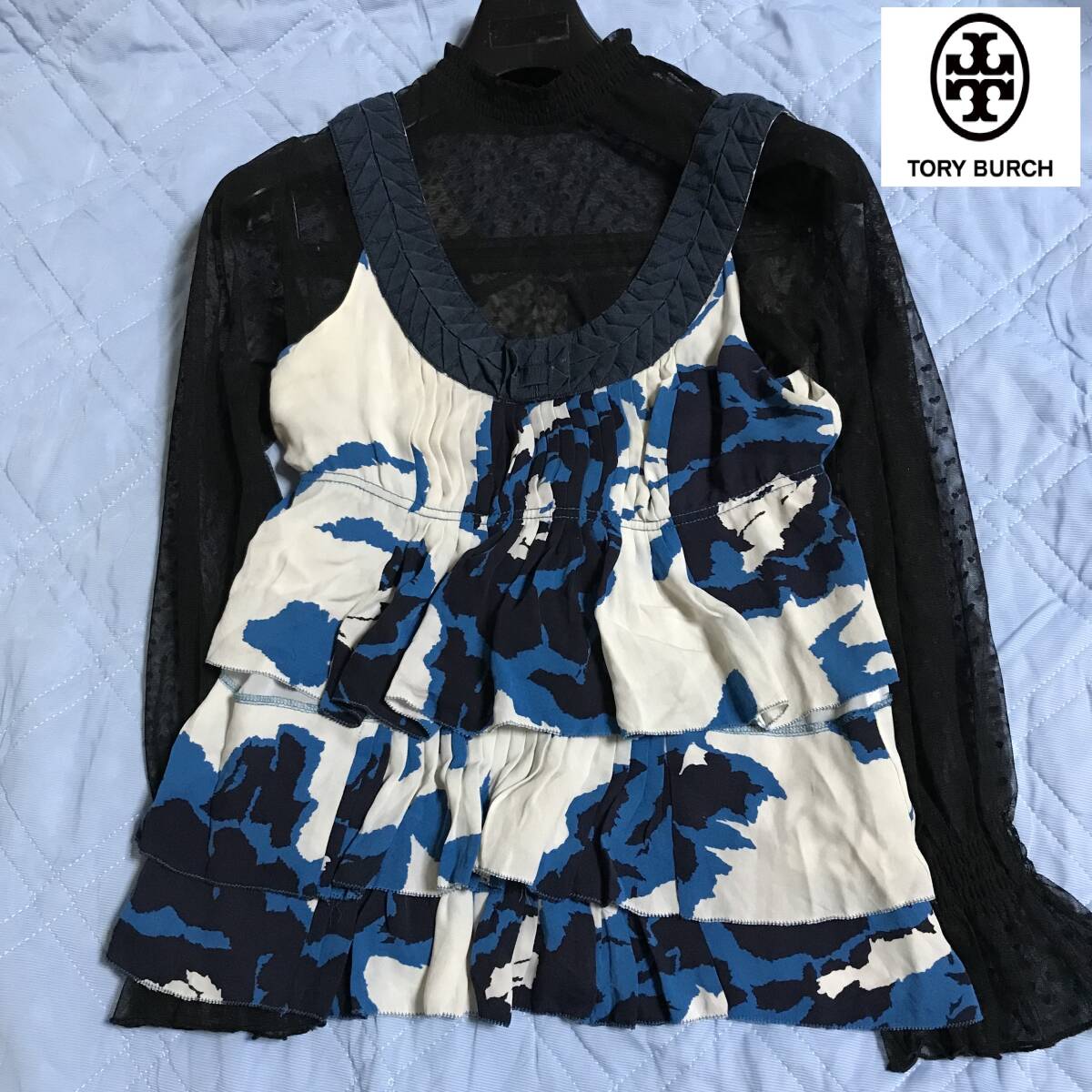 - トリーバーチ 白地に青紺色の柄周り紺リボン シルク100%ノースリーブカットソー 2 t238