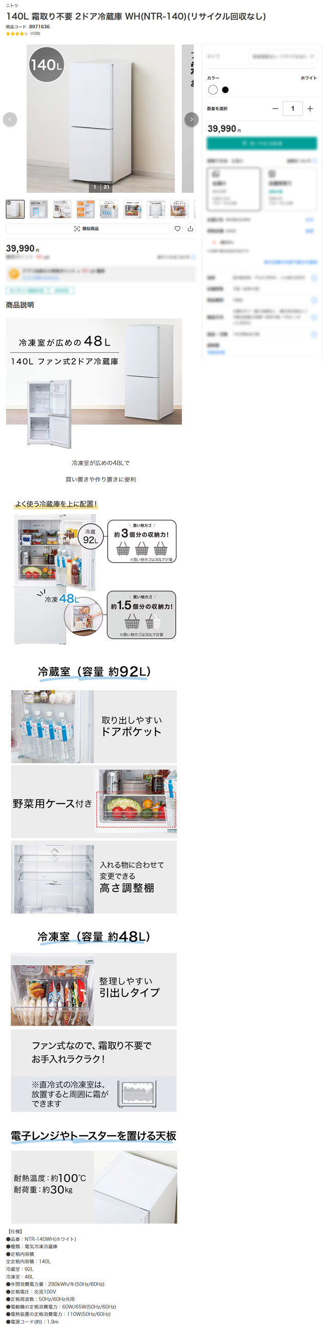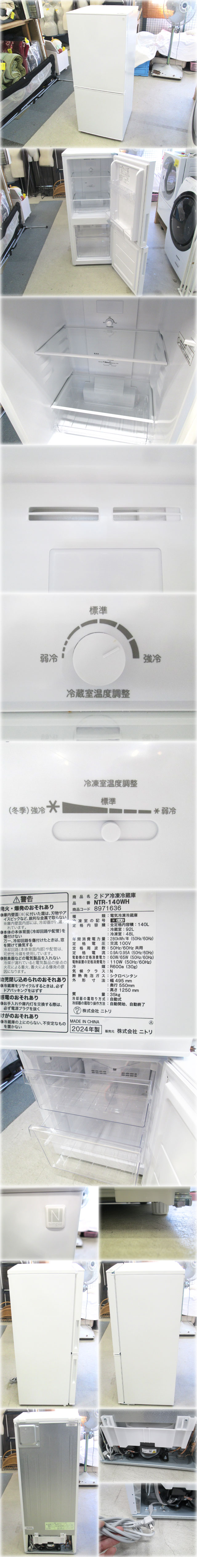 > 【2024年製】ニトリ 2ドア冷蔵庫 NTR-140WH 495x550x1250mm 140L(冷蔵92L/冷凍48L) 耐熱天板【長野発】