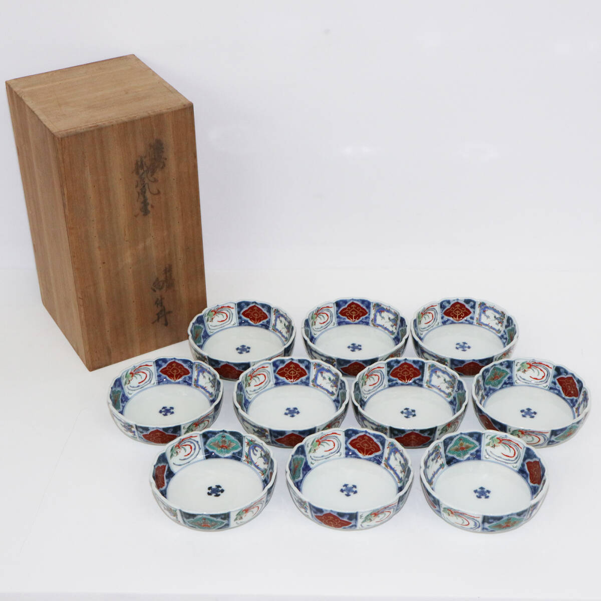 - 十二代目 酒井田柿右衛門 染錦 龍鳳凰画 桔梗 向付丼 10客 共箱 中皿 膾皿 1003-22