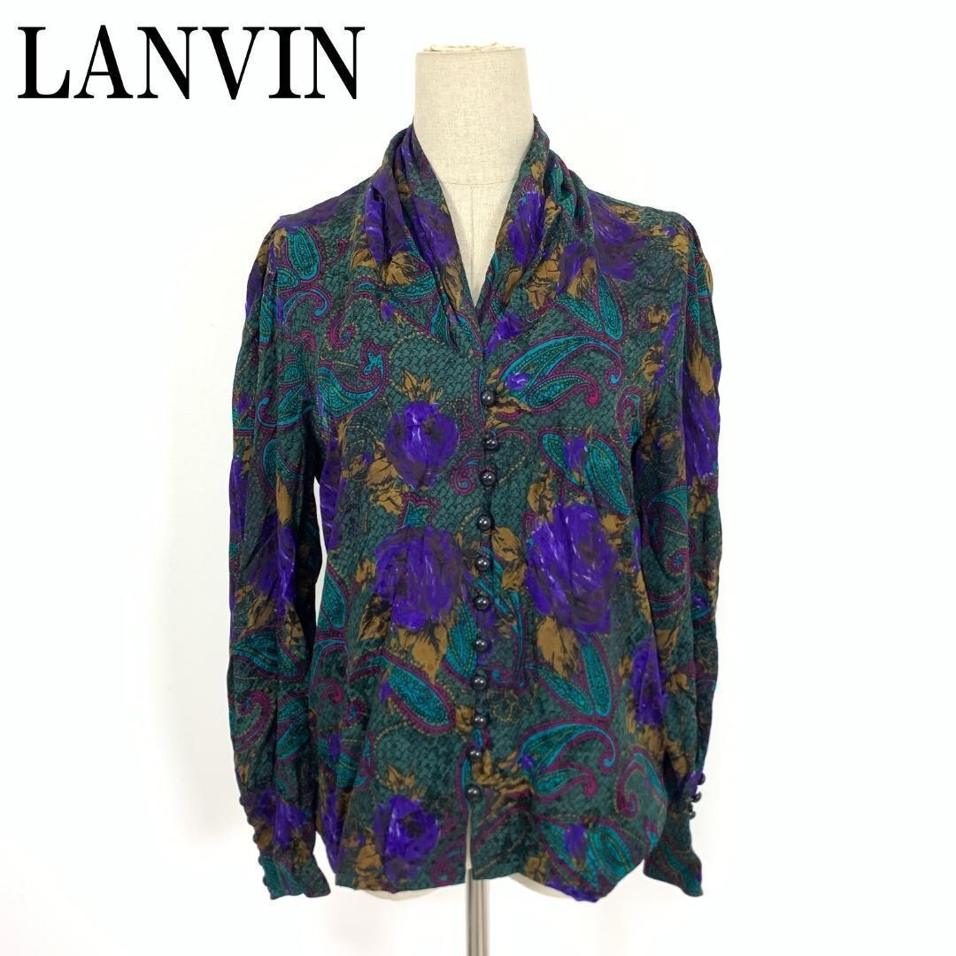 - LA7629 ランバン LANVIN Vネック 総柄 ボタンシャツ シルク100% ペイズリー柄 長袖ブラウス グリーン系L