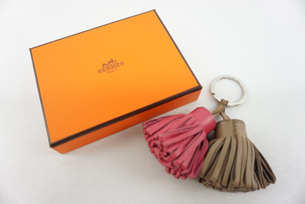 - ★【B送900円】2534 HERMES エルメス キーリング カルメンウノドス タッセル シルバー金具 ロゴサークル レザー ピンク&ブラウン