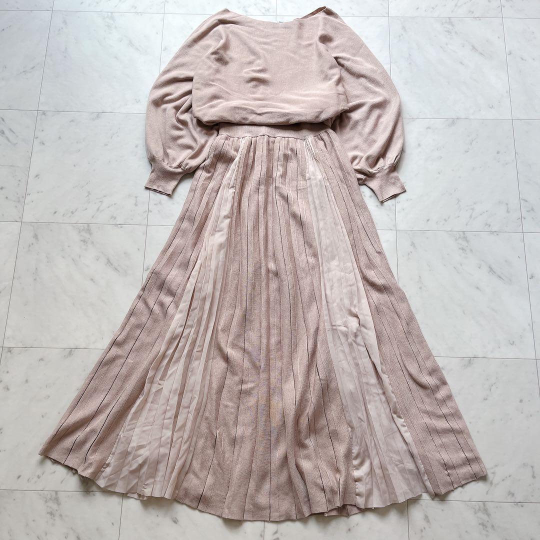 - 良品 eimy istoire エイミーイストワール ロングワンピース ニットワンピース シアー プリーツ ボリュームスリーブ ベージュ F