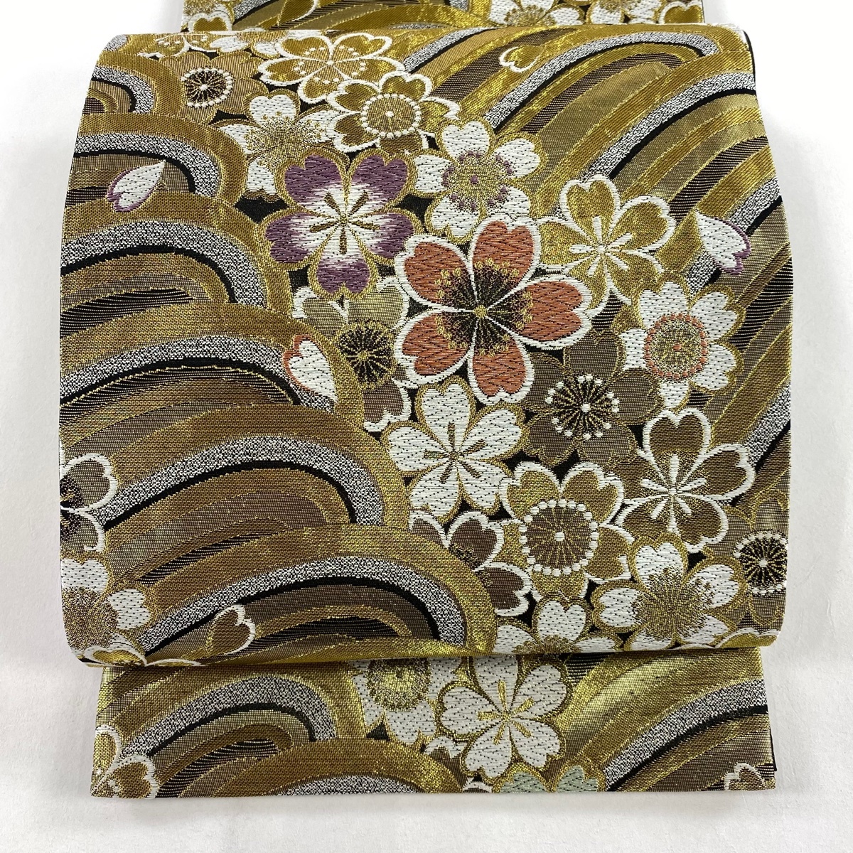 > 袋帯 秀品 桜 波 箔 ラメ糸 金色 六通 正絹 【中古】