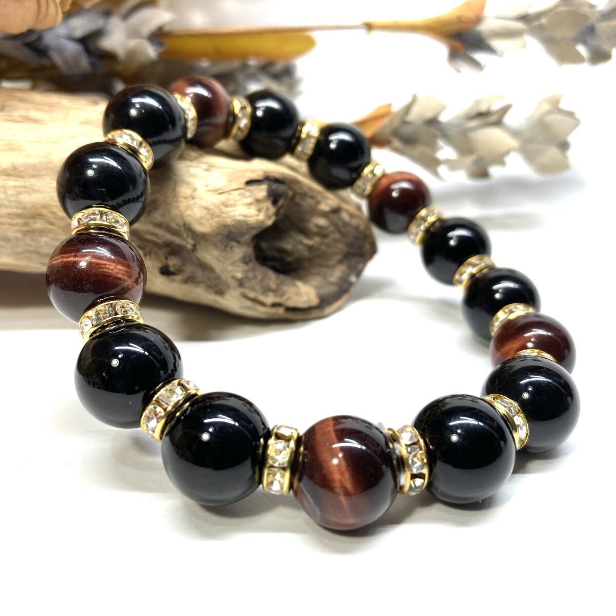 - モリオン&レッドタイガーアイ パワーストーン ブレスレット 天然石ブレス (ゴールド) 12mm 幸運 開運 メンズ 男性