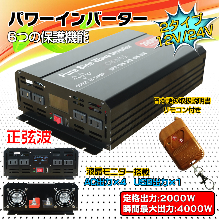 - インバーター 2000W 正弦波 12V リモコン付き モニター表示 車 コンセント4個 USB1個 AC100V 直流 変換 発電機 ee220-12
