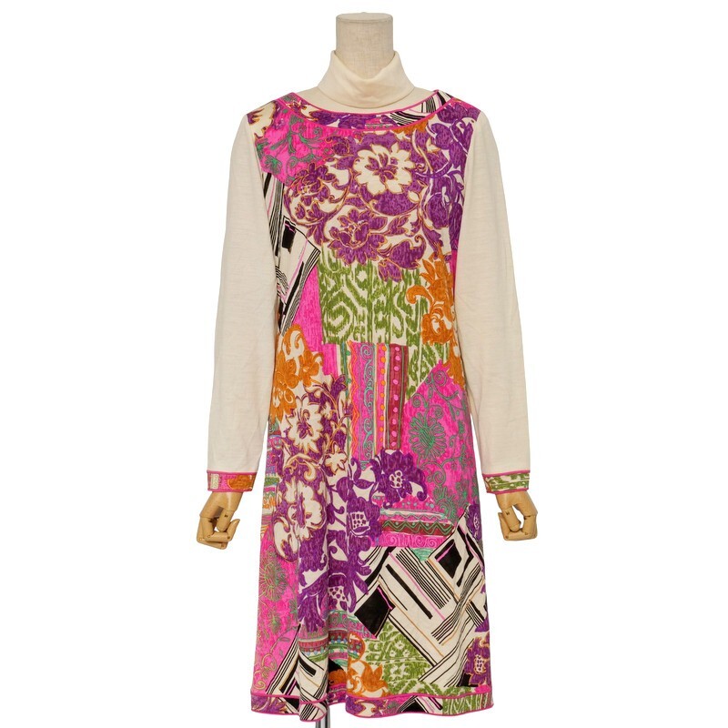 - TJ5068#レオナール*LEONARD*タートルネックワンピース*長袖*プリント*花柄*アイボリー系*サイズL