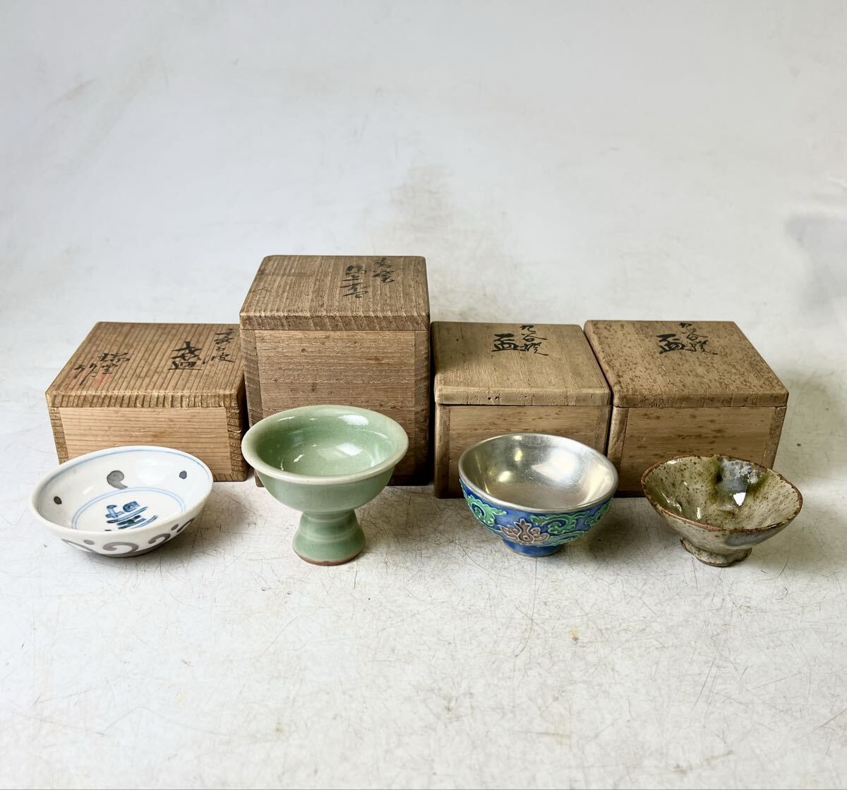 - 初出し品 名工いろいろまとめて 盃 4点 永楽善五郎 内銀張交趾盃 真清水蔵六 馬上盃 西尾瑞豊 盃 他 共箱 合箱 酒器