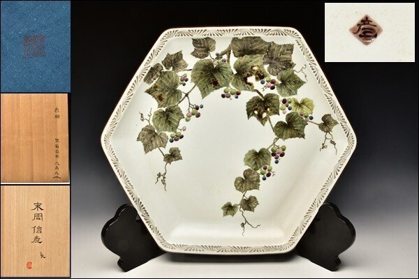 - U08412 49cm 末岡信彦 師 人間国宝 藤本能道 色絵 野葡萄図 六角 大皿 共箱 /3F