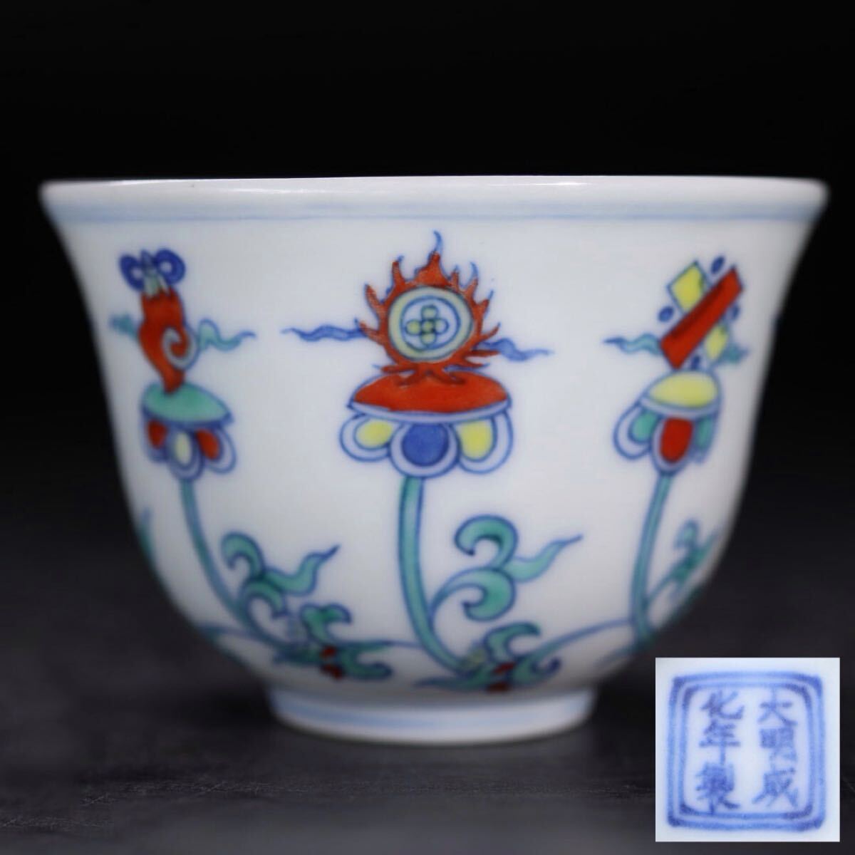 - 大明成化年製 底款 豆彩 色絵 煎茶碗 / 明 成化 中国美術 茶器 煎茶道具 .G2830