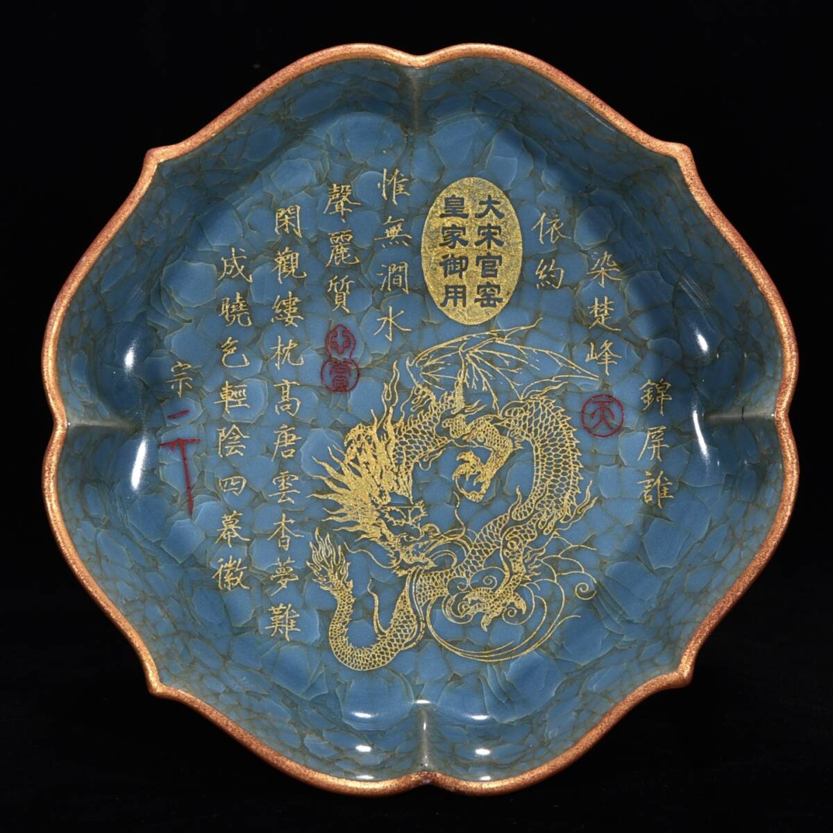 > A_YF0505【惠】人間国宝 中国骨董 陶芸 磁器【宋官窯藍釉氷割れ包口銘文金刻竜紋洗】工芸品 施釉陶 青花磁 陶芸 置物 收藏品