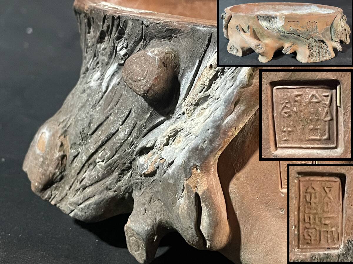 > 唐物 中国美術 朱泥花器 朱泥造形 中国古玩 朱泥植木鉢 在銘 リアリズム造形 木株型植木鉢 送料一律