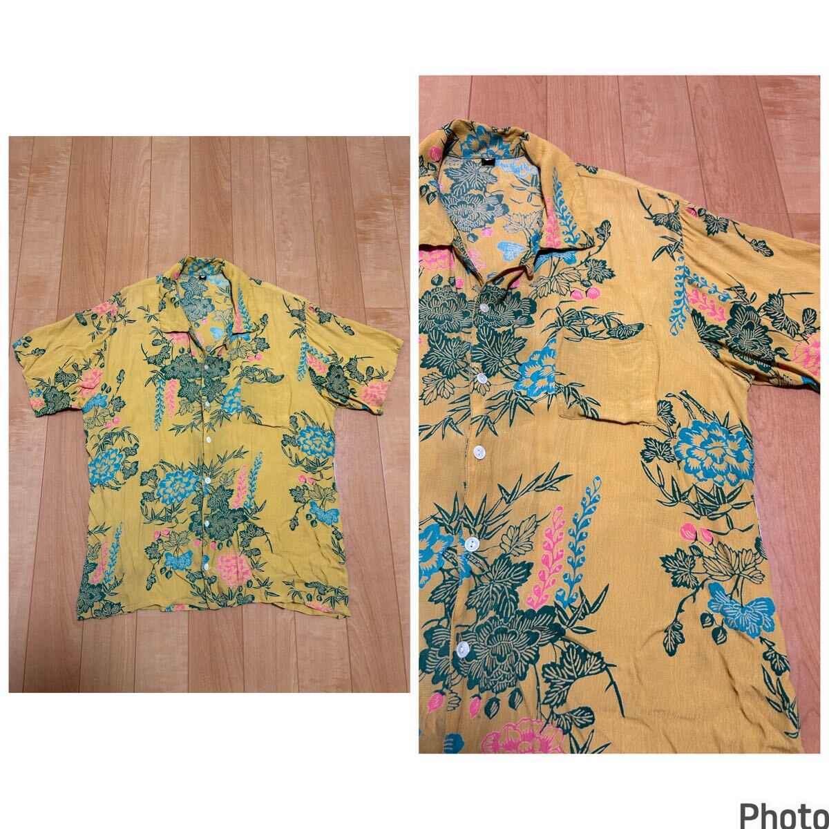 - 良品☆Unknown/和柄 メンズサイズL並 シワ加工ちりめんレーヨン.半袖開襟アロハシャツ 古風な発色&絵柄模様・牡丹?&笹.竹?他総柄 シェル釦