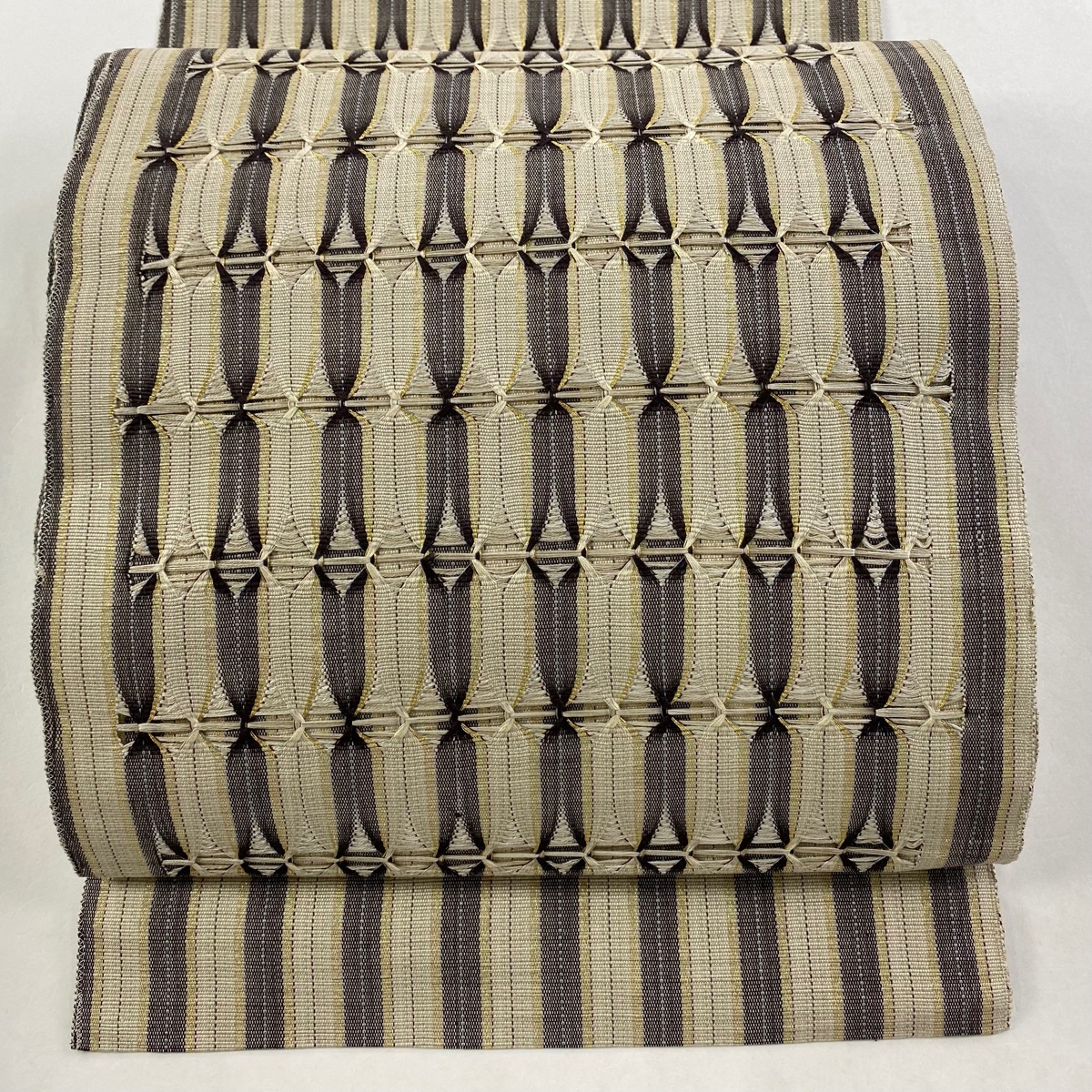 - 名古屋帯 秀品 八寸名古屋帯 松葉仕立て 幾何学 縞 金糸 ベージュ 正絹 【中古】