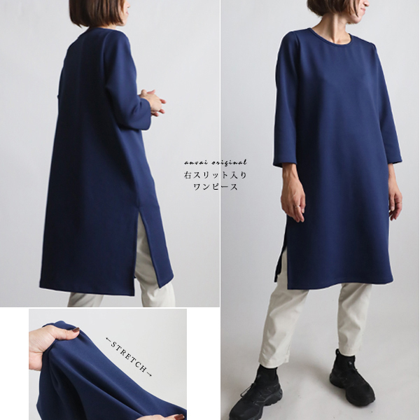 - 新作 103cm シワ知らず。ジャージ伸縮ストレッチ生地 右スリット入 ワンピース チュニック ネイビー K45B