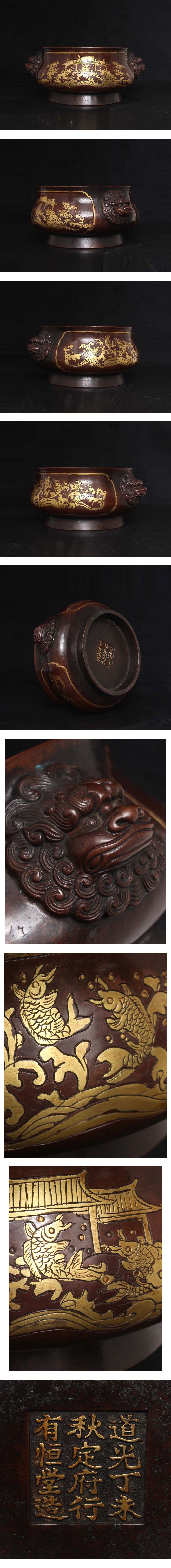 - ◆珍蔵◆中国古美術 道光年製款 古銅製 紫銅 塗金 高浮雕 鯉魚跳龍門双耳炉 細密細工造 置物 擺件 古賞物 骨董品 時代物 A13