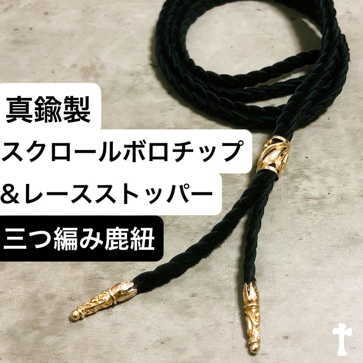 - 真鍮製 スクロール ボロチップ 三つ編み 鹿紐 レースストッパー セット カスタム パーツ ブラス brass ディアスキン 鹿革