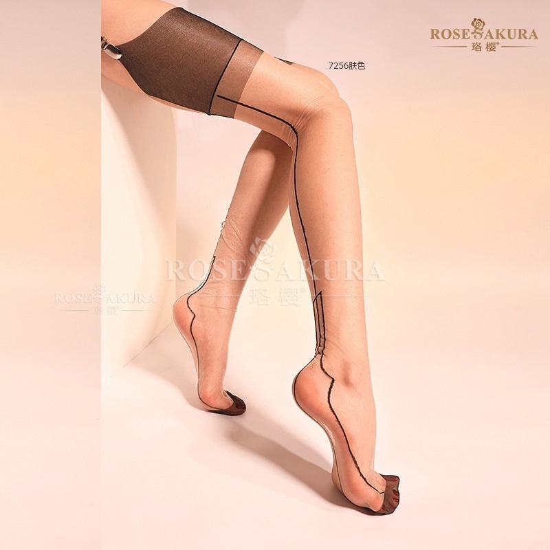 > Rosesakura/品番7256/ロゴ無しベージュバックシームMHヒール5デニール光沢/100%ナイロン/シームレスガーターストッキング