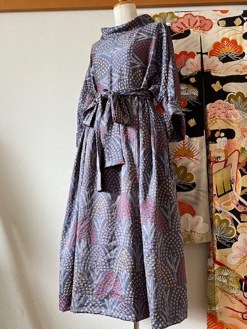 - 5885/総絞り~/青に木々の模様の総絞りの着物でウエスト切替ギャザーワンピース&リボン♪着物リメイク♪~♪お出かけに~七五三参りに~