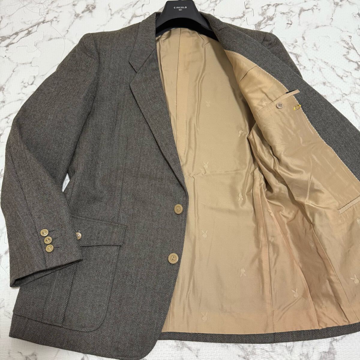 > 【美品】2XL位!!!高級 VIP PLAYBOY プレイボーイ メンズ ヘリンボーン テーラードジャケット グレー コルクボタン 裏地ウサギ柄 ゴールド