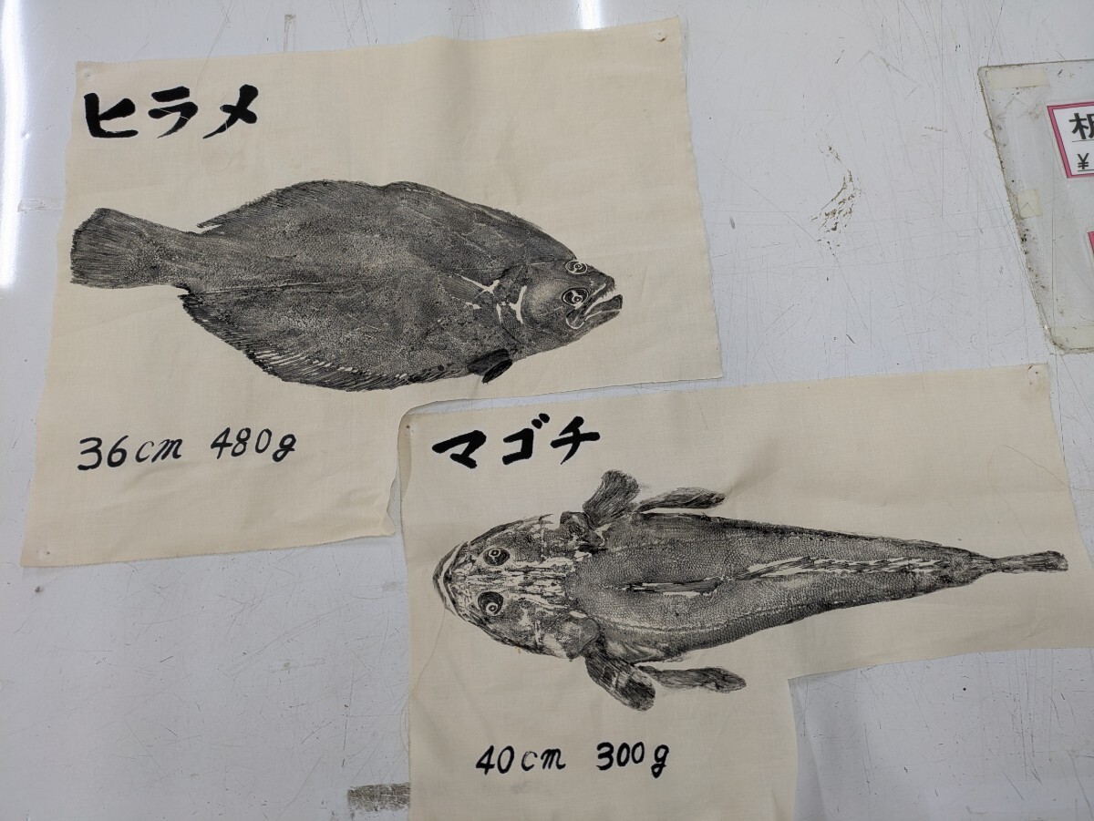 - ヒラメ、マゴチ、魚拓です。2枚セットです。ヒラメ、横42cm、縦34cmです。マゴチ、横40cm縦25cmです。