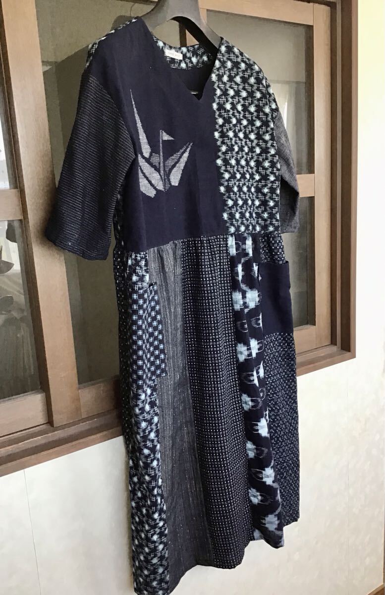 - 着物リメイク ワンピース 木綿 絣 縞 ハンドメイド