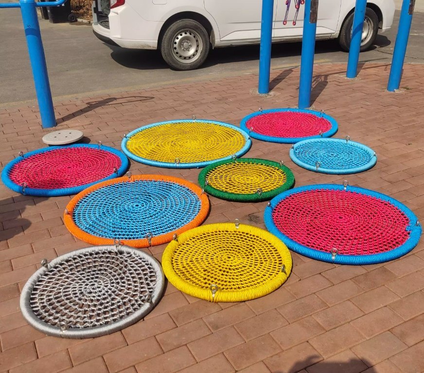 - 屋外の子供の巣網ロープ円盤ブランコ複数人が鎖ブランコ公園幼稚園でブランコ遊び