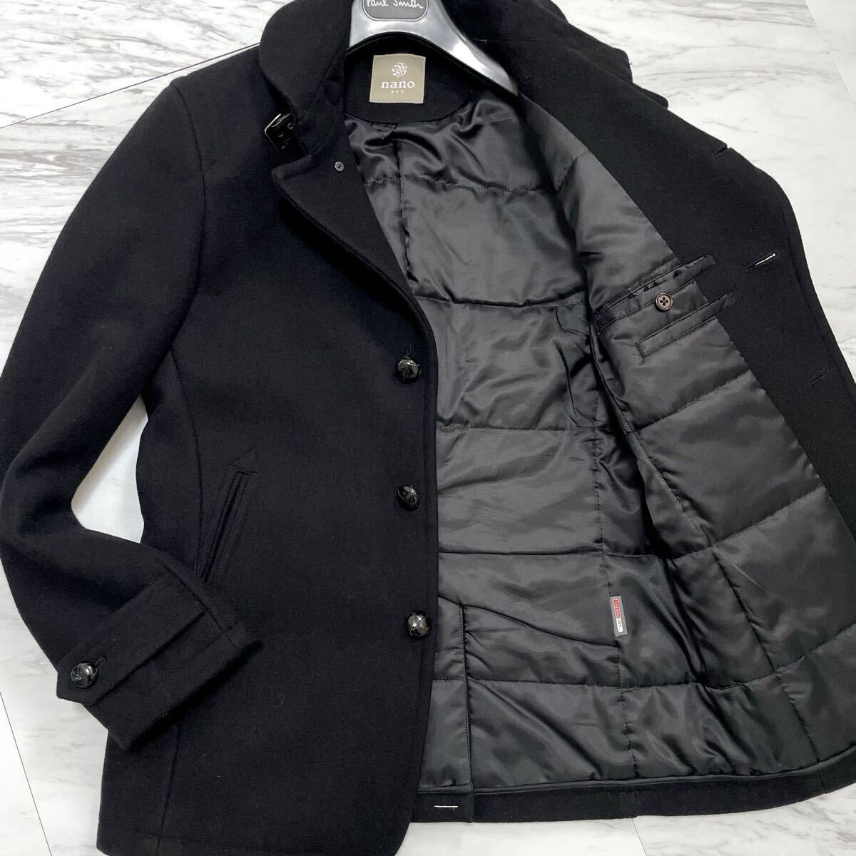 - 未使用級●ナノユニバース nano universe マリンコート ジャケット くるみボタン サーモライト 襟レザーベルト 牛革 ウール 黒 仕付け糸◎