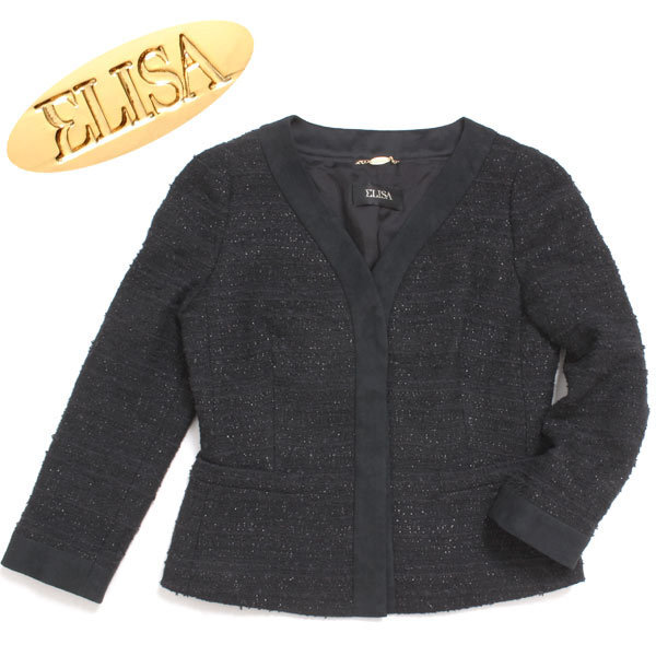 > ELISA ラメツイードマリアジャケット 定価106,920円 size2 ブラック 27100061 エリザ ノーカラージャケット