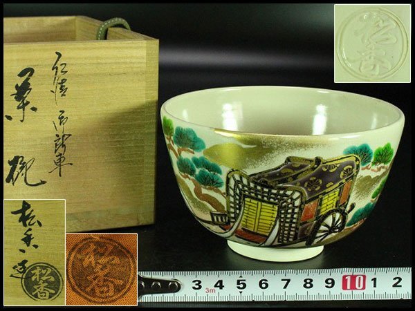 > 【金閣】茶道具 加藤松香造 御所車 松 色絵 茶碗 共布 共箱 抹茶碗 和食器 旧家蔵出 送料無料(YC492)