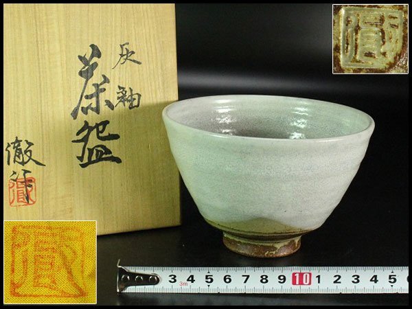 - 【金閣】茶道具 宇野徹造 灰釉 茶碗 共布 共箱 抹茶碗 和食器 旧家蔵出 送料無料(YC489)